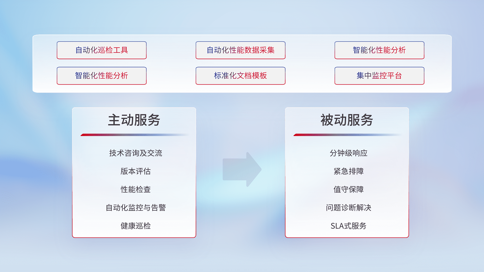智能化工具和标准化文档,,保障服务质量,,,提供主动服务(包含技术咨询、、、版本评估、、、、性能检查、、、、自动化监控与告警、、、健康巡检)和被动服务包含(分钟级响应、、、紧急排障、、值守保障、、、、问题诊断解决、、SLA服务)。。。。